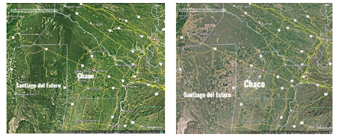 En las siguientes imágenes (Fig. 1) se puede apreciar el avance de la agricultura (en gris) sobre tierras con bosques nativos (en verde) como una mancha continua que atraviesa las provincias de Santiago del Estero y Chaco en un período de 15 años. En Chaco, la agricultura se expande en el sur de la provincia en la zona históricamente algodonera y busca avanzar en la región de bosques del noroeste de la provincia, conocida como el impenetrable chaqueño.