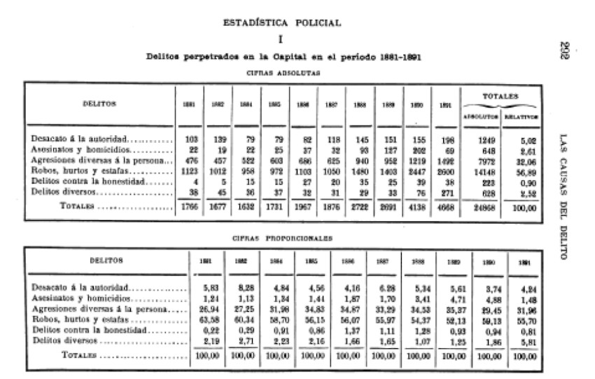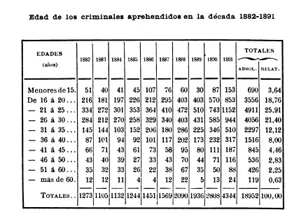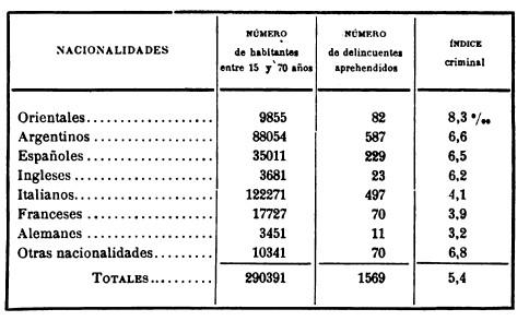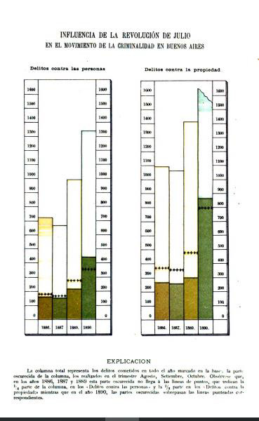 En las siguientes tablas y gráficos tomados de “Las causas del delito” se puede apreciar el uso de los datos estadísticos secundarios; proporcionados por la que luego sería la Dirección de Estadística a cargo Francisco Latzina. Cabe señalar el carácter “artesanal” de la información que se adjunta, muy especialmente el de los gráficos. Por entonces confeccionados totalmente a mano. También se destaca la forma en que los individuos de nacionalidad Uruguaya eran categorizados como orientales.