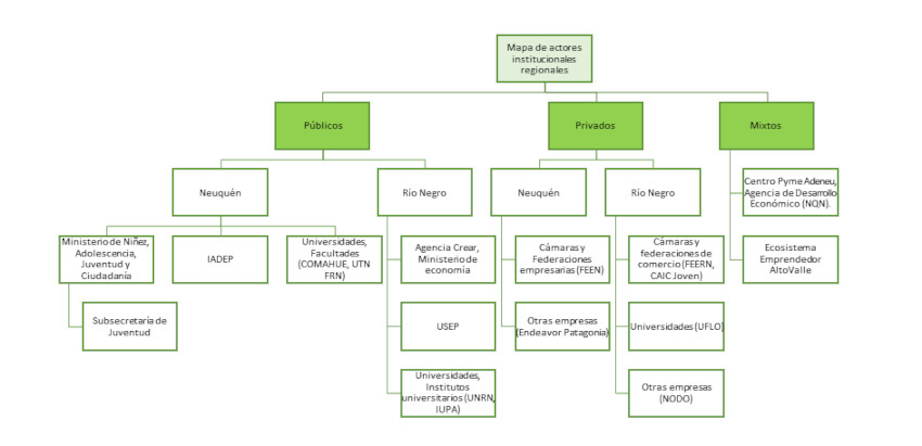 Además, podemos mencionar otras empresas y organizaciones, algunas de ellas de carácter nacional pero con sede en la región, como Endeavor Patagonia, dirigida a la “promoción de la cultura emprendedora; identifica emprendedores de alto impacto y les provee apoyo estratégico...”30 Así como una consultora privada radicada en la ciudad de Cipolletti, NODO, que se propone “Fortalecer el desarrollo del Ecosistema Emprendedor en la región, a través de la creación de diversos puntos de encuentro que promueven el aprendizaje, la conexión, la colaboración y la confluencia de ideas entre personas con intereses comunes.”31 Estos son solo algunos ejemplos de una amplia variedad de actores institucionales e individuales de carácter privado dirigidos a emprendedores.32