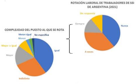 Estas características conforman un sector caracterizado por la alta disgregación de las negociaciones salariales y condiciones laborales también para los trabajadores locales formalizados. Los ajustes en función del desempeño no se utilizan únicamente en los trabajos remotos por plataformas, sino que también forman parte de la contratación formal local, borrando las escalas salariales a medida que se crece en responsabilidades y antigüedad en la empresa. Una consecuencia de este estado de situación por la falta de convenios colectivos propios, acordes al tipo de trabajo del sector SSI, es el uso de la rotación como medio para obtener aumentos salariales.17 De la encuesta a trabajadores informáticos realizada por el CIECTI se desprende que la mitad de los trabajadores de SSI encuestados (50,34%) rotan. Pero la encuesta revela que la rotación no se realiza mayormente a puestos de mayor complejidad, que podrían significar un avance en términos de la carrera profesional. Como indica el gráfico n°2, sólo el 16,89% rota a puestos de mayor complejidad, mientras que predomina la rotación a puestos de igual complejidad, o donde ésta es indistinta.18