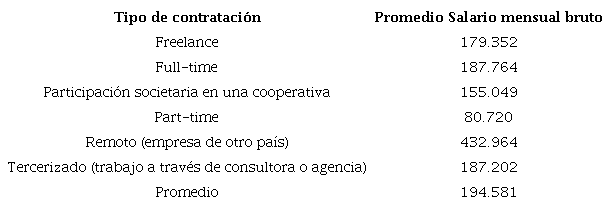 Sin embargo, una informante clave, responsable del área de recursos humanos de una ETN de software que realiza búsqueda de candidatos en América Latina, indica que son escasos los trabajadores que pesifican sus ingresos si trabajan como contractor, y resalta la preferencia de los trabajadores argentinos de SSI por puestos de trabajo de medio tiempo para el exterior, de manera de sostener un trabajo formal a la vez.