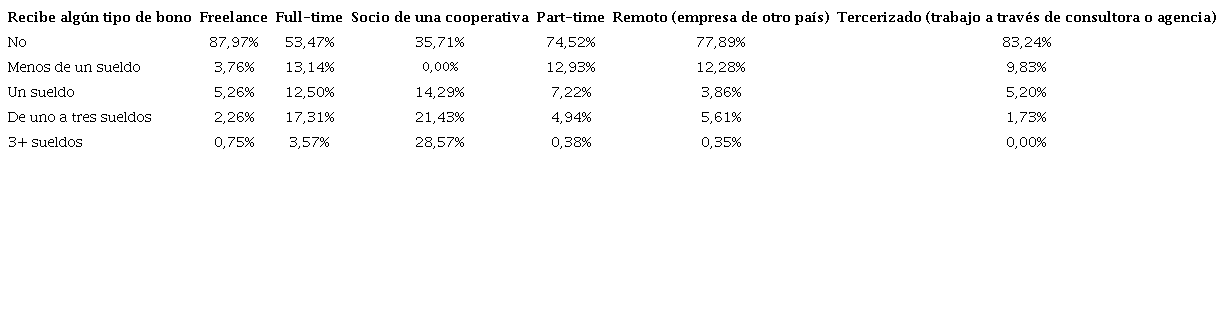 Respecto a los bonos por rendimiento, la encuesta de Sysarmy sobre este punto indica que cerca del el 40% de los encuestados - trabajadores IT en Argentina bajo distintas modalidades de contratación - recibieron bonos. El pago de bonos constituye un mecanismo específico que busca asegurar la obtención de resultados en el trabajo, planteando incentivos para el cumplimiento de metas. Pero los datos muestran que este tipo de incentivo resulta mucho más frecuente entre los trabajadores full-time bajo contrato formal que los freelance o trabajadores remoto (Tabla n°2).