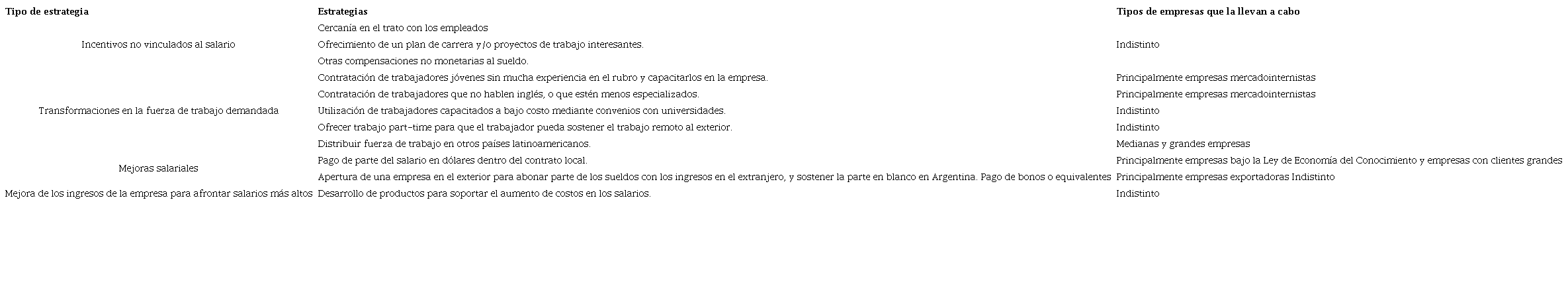 En tercer lugar, las entrevistas realizadas a empleadores locales de SSI resultan una forma de conocer las consecuencias que tiene la irrupción de las plataformas digitales en las condiciones de trabajo de la totalidad del sector SSI, a partir de indagar en las estrategias que llevaron a cabo en este período para retener a los trabajadores. En este sentido, las entrevistas sugieren que el trabajo de plataformas impone a las empresas de la periferia una mejora en las condiciones de trabajo para retener a sus empleados, por lo que el alza se extiende - aunque desigualmente - a todos los salarios del sector. Por un lado, un aumento de salarios dado por el pago de la totalidad o una parte del mismo en dólares, así como el pago de beneficios en forma de bonos o premios que llegan de manera directa al trabajador. Por el otro, incentivos no vinculados al salario, que impactan positivamente en las condiciones laborales. Para ello se vuelve necesaria la mejora de los ingresos de la empresa por medio del desarrollo de un producto que lo permita, o bien la elusión o evasión fiscal. Finalmente, destacamos que las estrategias que apuntan a cambios en el tipo de fuerza de trabajo demandada permiten la capacitación de trabajadores con menor experiencia y la incorporación de trabajadores sin conocimiento del idioma inglés en puestos que antes quizás lo requerían.