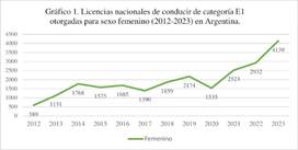 En el transporte, tan sólo el 11 por ciento de las personas ocupadas en Argentina son mujeres (MMGyD,2023)7. Según datos del Observatorio de Seguridad Vial (OSV), las licencias nacionales de conducir otorgadas a mujeres pasaron de 589 en 2012 a 4139 en 2023 para la clase E18 (vehículos automotores con uno o más remolques o articulaciones), dando cuenta de un incremento de licencias otorgadas a mujeres para la conducción de unidades de gran porte. Sin embargo, según muestra el gráfico 1 el otorgamiento de estas licencias muestra fluctuaciones, con ascensos y descensos en la emisión de licencias E1 para mujeres, situación que podría asociarse a dinámicas de crisis económicas, domésticas que afectarían el acceso a licencias para conducir unidades de mayor porte (con uno o más remolques o articulaciones). Ejemplo de ello podría ser el descenso durante el año 2020 que podría estar asociado a las condiciones de aumento en la demanda de cuidados y tareas domésticas durante la pandemia por COVID 199.