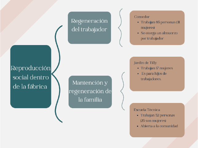 En la Figura N°1 expresamos las formas de reproducción social al interior de la fábrica. El comedor, recuperado a partir de la lucha de los trabajadores en 2013, cumple un rol en la regeneración cotidiana del trabajador proporcionado una comida diaria. Por su parte, existe una política de la empresa hacia la mantención y regeneración de la familia de este a partir del jardín y la escuela técnica.