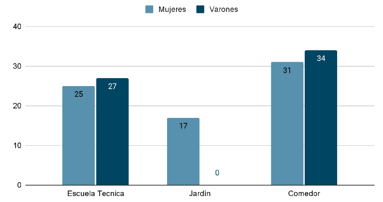 De esta forma, una parte considerable de las trabajadoras ingresaron a la fábrica a partir de realizar trabajos vinculados a la reproducción social. Actualmente, el 18% de las trabajadoras realiza trabajos asociados a este tipo de tareasl, mientras que en el caso de los hombres esta cifra es sólo del 2%. En el gráfico N°1 expresamos la cantidad de mujeres y varones trabajando en cada área de trabajo.
