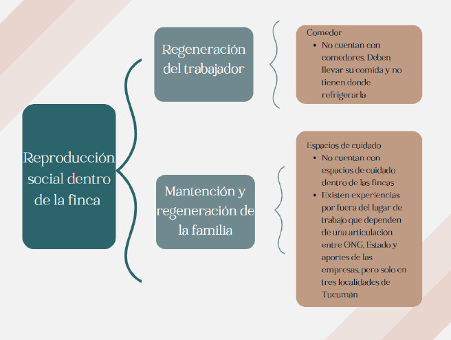 Nuestro trabajo no termina solo al salir de la finca. Nosotras somos mamá, somos esposa. Tenemos nuestra responsabilidad en casa, muchas veces llegamos, tenemos que venir, bañarse, cocinar, a veces, la limpieza, la lavada de ropa y todo eso y no se termina el día ahí, muchas veces somos las primeras que se levantan y las últimas que nos acostamos (María, Tucumán, agosto de 2023, realizada por la autora).