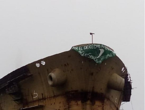 Durante el año 2018 la demanda por el aborto legal, seguro y gratuito con la “marea verde”,12 irrumpe en la fábrica, en el marco de la votación en el senado del derecho al Aborto Legal, Seguro y Grauito (el 8 de agosto de 2018). La agrupación de mujeres “Juana Azurduy” decidió colgar un “pañuelo verde” en el barco en el que estaban trabajando los trabajadores del ARS, para visibilizar la demanda por este derecho. Esta acción es luego tomada como propia por el conjunto de la militancia de las trabajadoras del astillero.
