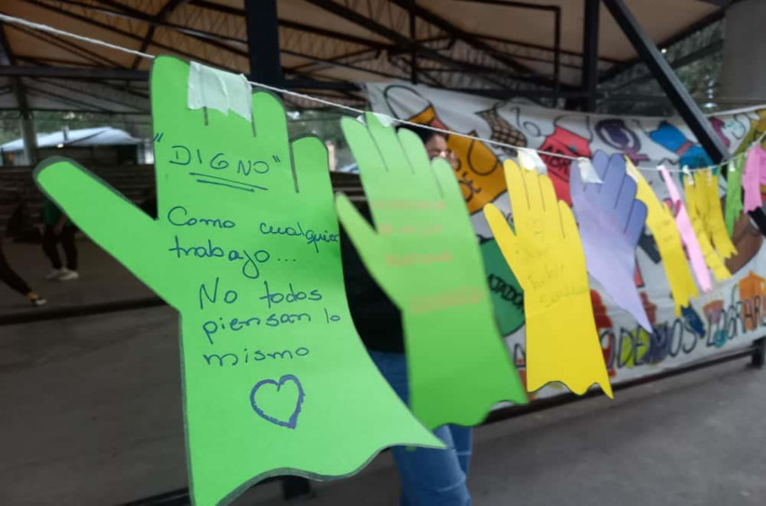 La primera actividad de la jornada, proponía reflexionar sobre el significado de la labor que realizan cotidianamente. Ana explicó que la participación de cada trabajadora debía quedar plasmada en un guante de cartulina que luego sería colgado en un tendedero. La pregunta central que permitía encadenar sus reflexiones sería: "¿Qué significado tiene el trabajo que realizan a diario y en qué palabras lo podrían describir?". A continuación, se detallan algunas de las frases y palabras8 que las trabajadoras plasmaron en los guantes de cartulina y que fueron registradas en un cuaderno de campo9: “Mucho esfuerzo”, “Ser reconocida por mi trabajo”, “La esperanza de un día sentirme valorada”, “Dejamos nuestras familias, mucho sacrificio y no somos bien pagadas, muchas aguantamos malos tratos”, “DIGNO, como cualquier trabajo. No todos piensan lo mismo”, “Es un trabajo sacrificado”, “Honestidad, amor y esfuerzo”, “En mi caso, me gustaría que me valoren todo lo que hago, no que se aprovechen”, “Que valoren nuestro esfuerzo”, “Más empatía, respeto y buena comunicación”, “Que respeten nuestros derechos”, “Solidaridad”.