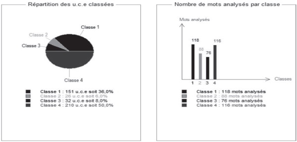 O relatório do Alceste registou a divisão do corpus em Unidades de Contexto Elementar (UCEs) 419 UCEs do grupo BR e 457 UCEs do grupo PT. Dessas, 91% e 88% do respetivo corpus foram consideradas relevantes e analisadas pelo programa, o que resultou na distribuição do conjunto dos dados textuais em quatro classes, a partir 481 ou 79% UCEs, garantindo um satisfatório aproveitamento do corpus. Seguindo as etapas de Bardin (2009), optou-se pela apresentação, em separado, dos dois países como forma de melhor visualização, uma vez que o rigor, a validade e a fidedignidade já haviam sido testadas.