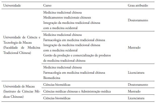 O Governo de Macau valoriza o desenvolvimento e implementação da MTC. Com a aprovação do Governo de Macau, a Faculdade de Medicina Tradicional Chinesa da Universidade de Ciência e Tecnologia de Macau (University of Science and Technology, MUST) foi fundada em 2000, tendo disponibilizado nesse mesmo ano o Curso de Licenciatura em MTC. No início de 2011, a universidade tornou-se a instituição de apoio do Laboratório de Referência do Estado para Investigação de Qualidade em Medicina Tradicional Chinesa (State Key Laboratory of Quality Research in Chinese Medicine, SKL-QRCM). Em 2003, em resposta à crescente necessidade de cuidados médicos da população local, a MUST, com a aprovação dos Serviços de Saúde de Macau, criou uma clínica de MTC. Esta clínica também permitia a prática clínica de estudantes e docentes de medicina da MUST. Recentemente, a Faculdade de Medicina Tradicional Chinesa da MUST passou a oferecer cursos de Licenciatura, Mestrado e Doutoramento em MTC (Tabela 1; Macau University of Science and Technology, 2016a). A Universidade de Macau criou o Instituto de Ciências Médicas Chinesas (Institute of Chinese Medical Sciences, ICMS) e o SKL-QRCM em 2002. O ICMS/SKL-QRCM dedica-se à promoção da investigação em MTC e à capacitação de talentos locais nas áreas interdisciplinares das ciências biomédicas e farmacêuticas. O ICMS/SKL-QRCM começou a oferecer cursos de Mestrado em Ciências Médicas Chinesas e Administração Medicinal em 2002, oferecendo atualmente o curso de Licenciatura e Doutoramento em Ciências Biomédicas (Tabela 1). A Comissão de Especialistas do Ministério da Ciência e Tecnologia de Beijing avaliou positivamente as iniciativas do SKL-QRCM (na Universidade de Macau e na Universidade de Ciência e Tecnologia de Macau) e aprovou a avaliação intermédia do SKL em 2013 (University of Macau, 2016a).