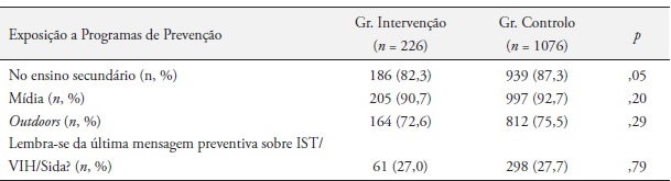 Na Tabela 4 verificamos que 82,3% dos jovens do grupo de intervenção e 87,3% dos jovens do grupo de controlo já tinham sido abrangidos por programas de prevenção do VIH/SIDA no ensino secundário. Verificamos também que 90,7% dos jovens do grupo de intervenção e 92,7% do grupo de controlo tinham recebido informação sobre prevenção do VIH/SIDA através dos media; e que 72,6% dos jovens do grupo de intervenção e 75,5% dos jovens do grupo de controlo tinham estado expostos a mensagens preventivas através de outdoors. Porém, quando questionados sobre se se lembravam da última mensagem preventiva sobre IST/VIH/SIDA, apenas 27% dos jovens do grupo de intervenção e 27,7% dos jovens do grupo de controlo responderam afirmativamente. Verificamos, com o teste de Qui-quadrado que os grupos são homogéneos no que respeita às variáveis estudadas, dado que os valores de p não são significativos.