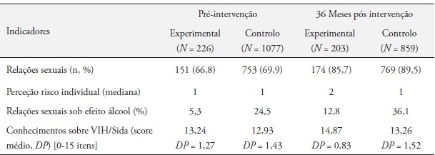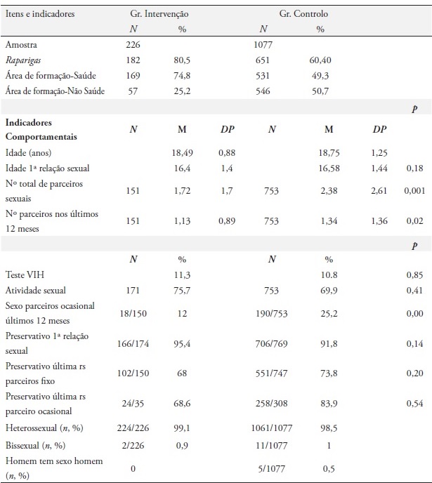Relativamente a outros indicadores, os grupos de intervenção e de controlo, por esta ordem, não se revelaram homogéneos, designadamente quanto ao número médio de parceiros sexuais ao longo da vida (M = 1,72 vs. M = 2,38; p < 0,001), ao número médio de parceiros sexuais nos últimos 12 meses (M = 1,13 vs. M = 1,34; p = 0,02), à prática de sexo com parceiros ocasional nos últimos 12 meses (12,0% vs. 25,2%; p = 0,00).