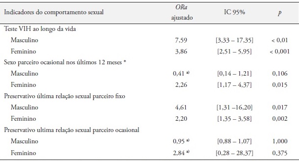 o teste VIH (ORa:7,59:[3,33-17,35]), e o sexo com parceiro casual nos últimos