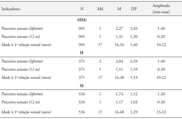 A amostra de 1.303 alunos do primeiro ano do ensino superior distribuiu-se da seguinte medida: universitário e politécnico de Coimbra 42,5%, da Universidade de Aveiro 31,8%, Universidade da Beira Interior 25,6%. A distribuição por idades varia entre os 18 e os 24 anos (M = 18,71, DP = 1,20). A distribuição por sexos apresenta um predomínio do sexo feminino (63,9% mulheres vs. 36,1% homens), predomínio que é habitual em populações do ensino superior. Quanto à área de formação académica, 53,7% integram cursos da área da saúde e 46,3% integram outros cursos, designados não saúde. Fazendo uma análise do comportamento sexual dos elementos da amostra, conforme se pode observar na Tabela 1, a média global de idade das primeiras RSs é de 16,56, DP = 1,40 sendo de M = 16,38; DP = 1,53 no sexo masculino e de M = 16,68; DP = 1,29 no sexo feminino. De notar que 6,1% dos participantes referem ter tido as primeiras RSs antes dos 15 anos, sendo esse valor de 9,32% nos rapazes e de 3,94% nas raparigas (Tabela 2). A média de parceiros sexuais ao longo da vida é de M = 2,27; DP = 2,49, sendo que no sexo masculino é de M = 3,04, DP = 3,29 e no sexo feminino M = 1,74; DP =1,52. Quanto ao número de parceiros sexuais nos últimos 12 meses, a média global é de 1,31; DP = 1,30, sendo de M = 1,51, DP = 1,59 no sexo masculino e de M = 1,17; DP = 1,03 no sexo feminino.