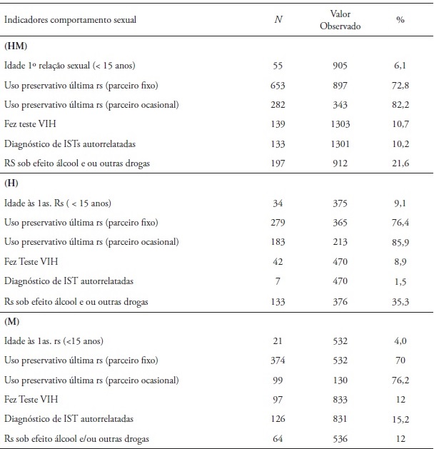 Como se pode observar na Tabela 2, o uso do preservativo na última relação sexual com parceiro fixo foi de 72,8%, no sexo masculino foi de 76,4% e de 70% no sexo feminino. O uso do preservativo na última relação sexual com parceiro ocasional é referido por 82,2%, sendo de 85,9% nos rapazes e de 76,2% em raparigas. Quanto à realização do teste de VIH para conhecimento do estado serológico, 10,7% dos inquiridos tinham feito este teste, sendo 8,9% do sexo masculino e 12% do sexo feminino. Quanto às ISTs autorrelatadas (presença de sintomas como corrimento vaginal anormal, e a doenças diagnosticadas, passadas ou presentes), constata-se que 10,2% dos inquiridos referiram ter atualmente, ou ter tido, uma IST ou sintomas, sendo 1,5% do sexo masculino e 15,2% do sexo feminino. Esta discrepância deve-se, provavelmente, à sobrevalorização dos corrimentos vaginais. Uma análise mais pormenorizada revela que 106 das 831 raparigas (12,75%) referiu ter ou ter tido corrimento vaginal anormal. Quando é excluída a resposta corrimento vaginal anormal verifica-se que as ISTs diagnosticadas nas mulheres da amostra são de 2,41%. Analisando o indicador RSs sob efeito de álcool ou outras drogas, observou-se que esse comportamento ocorreu em 21,6% dos respondentes, sendo de 35,3% no sexo masculino e de 12% no sexo feminino.
