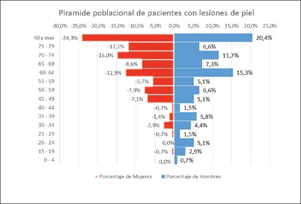 Los hallazgos muestran una población con LPRC en un 50,5% femenina, 88,8% mestiza, con edades entre 20 días y 96 años de edad, con un promedio de 63,9 años, dentro de los cuales la mayor frecuencia se da en pacientes mayores de 60 años con 67,1%; los grupos de edad más afectados se ubican entre 60 y 65 años y 70 y 74, con 14,8% y 13,2% respectivamente, y el 10,4% entre 80 y 85 años (Figura 1).