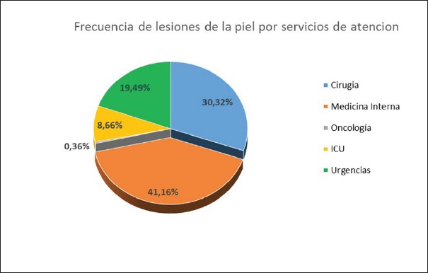 La frecuencia por servicio se evidencia mayoritariamente en los servicios de medicina interna y cirugía con un 41,16% y 30,32% respectivamente. Estas cifras son similares a las reportadas en los servicios de medicina interna con el 41%, ortopedia con el 8% y 7% en los servicios de UCI, urgencias y atención domiciliaria (González Consuegra et al., 2014). Coinciden a su vez con estudios europeos con frecuencias del 31% en cuidados paliativos, el 57% en cuidados prolongados, el 22% en rehabilitación y el 81% geriatría (Ramos et al., 2013). Estos resultados pueden ser equiparables, ya que un gran porcentaje de los pacientes con presencia de lesiones y edad avanzada suelen ser hospitalizados en estos servicios. Para el caso de otras lesiones como DAI, MARSI, Skin Tears, LPD, UV y UA la literatura indexada no dispone de datos comparables.