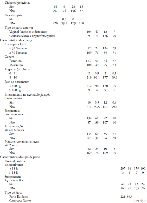 Por outro lado, nos processos das crianças recolhemos a idade gestacional, o peso ao nascimento, o índice de Apgar ao 5º minuto, internamento imediato na unidade de cuidados de neonatologia, presença de hipoglicemia, taquipneia transitória e incidência de patologias até aos 2 anos (gastroenterite, infeção urinária, otite, amigdalite, alergias) nas situações em que o diagnóstico e os cuidados à criança foram prestados no hospital onde decorreu a investigação.