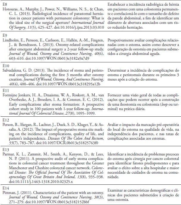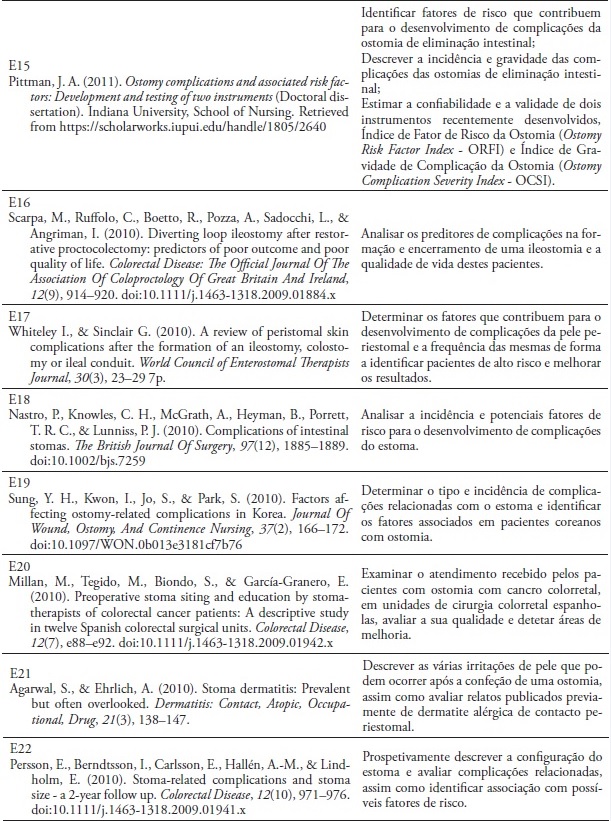 No que refere ao tipo de estudos incluídos na presente revisão, verifica-se que maioritariamente são descritivos (seis artigos) e de coorte (10 artigos). Apenas foi encontrado um ensaio clínico aleatório controlado e uma revisão da literatura, esta centrada, em particular, nas complicações da pele periestomal. No que se refere aos objetivos dos diferentes estudos analisados, encontram-se descritos, em síntese, na Tabela 2.