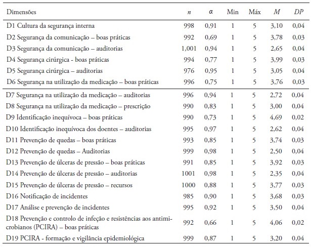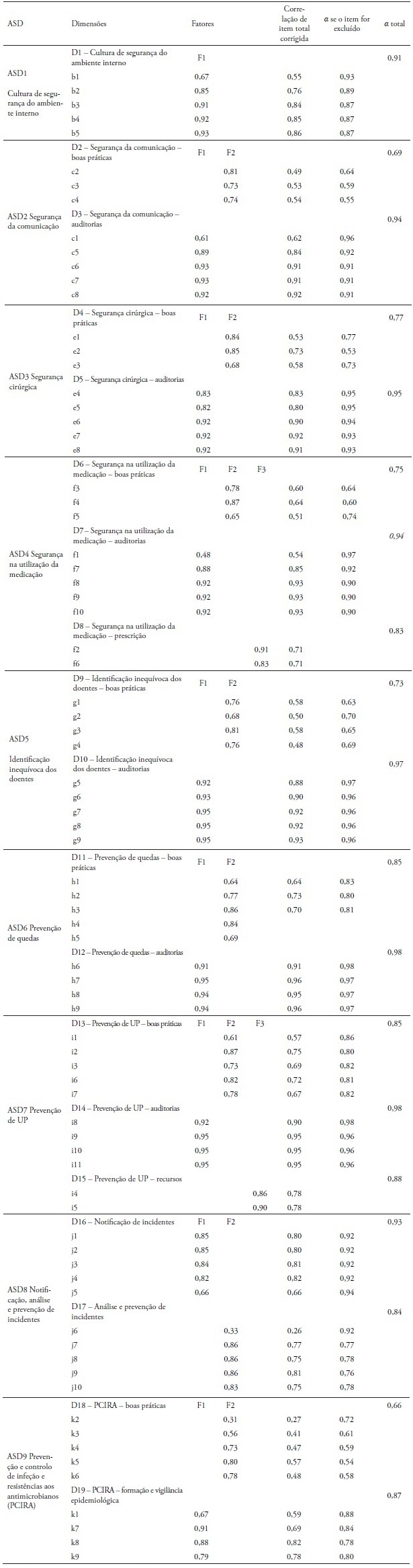 Deste processo resultou uma versão constituída por 79 itens, pontuáveis em cinco níveis sob a forma de escala tipo Likert, pontuáveis de 1 (nunca) a 5 (sempre), agrupados teoricamente em 9 ASD como se apresenta: (1) ASD1 “Cultura de segurança do ambiente interno” (itens b1; b2; b3; b4; b5); (2) ASD2 “Segurança da comunicação” (itens c1; c2; c3; c4; c5; c6; c7; c8); (3) ASD3 “Segurança cirúrgica” (Itens e1; e2; e3; e4; e5; e6; e7; e8); (4) ASD4 “Segurança na utilização da medicação” (itens f1; f2; f3; f4; f5; f6; f8; f9; f10); (5) ASD5 “Identificação inequívoca dos doentes” (itens g1; g2; g3; g4; g5; g6; g7; g8; g9); (6) ASD6 “Prevenção de quedas” (itens h1; h2; h3; h4; h5; h6; h7; h8; h9); (7) ASD7 “Prevenção de UP” (itens i1; i2; i3; i4; i5; i6; i7; i8; i9; i10; i11); (8) ASD8 “Notificação, análise e prevenção de incidentes” (itens j1; j2; j3; j4; j5; j6; j7; j8; j9; j10); (9) ASD9 “Prevenção e controlo de infeção e resistências aos antimicrobianos” (itens k1; k2; k3; k4; k5; k6; k7; k8; k9).
