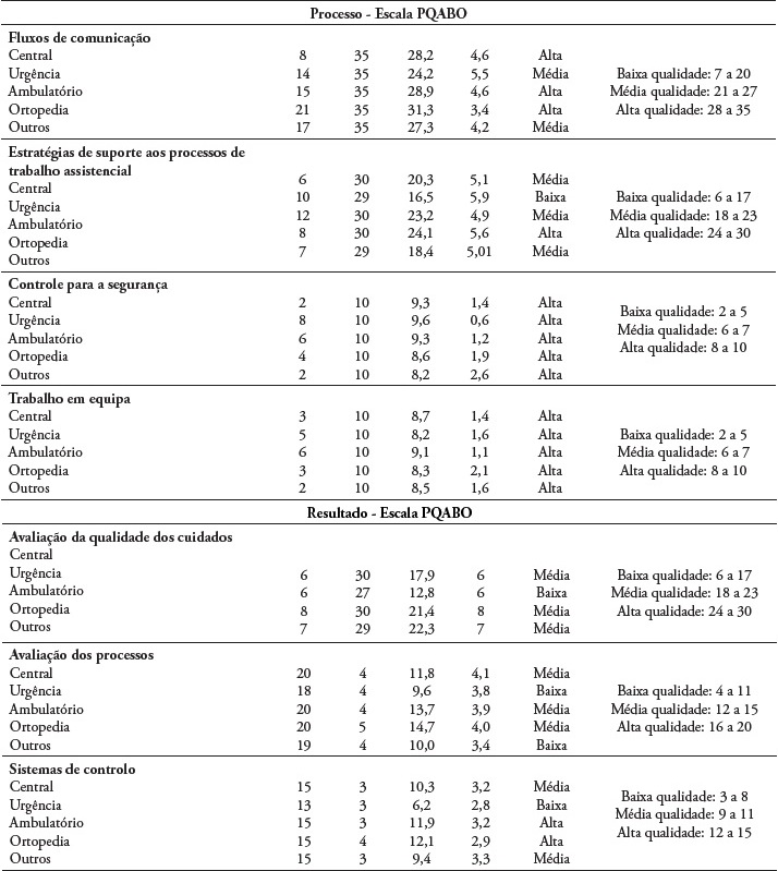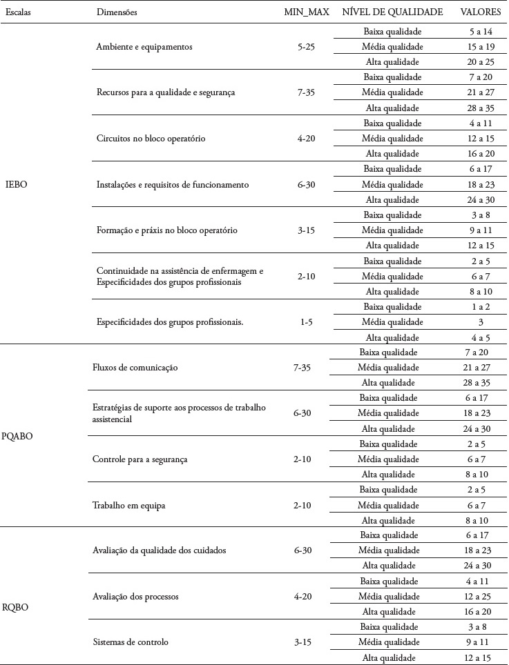 A RQBO é composta por 13 itens agrupados em três dimensões: Avaliação da qualidade dos cuidados (6 itens), Avaliação dos processos (4 itens), Sistemas de controlo (3 itens), da autoria de Gomes et al. (2019). De modo a facilitar a compreensão das escalas estas são apresentadas na Tabela 1 integrando as suas diferentes dimensões e respetivas avaliações.