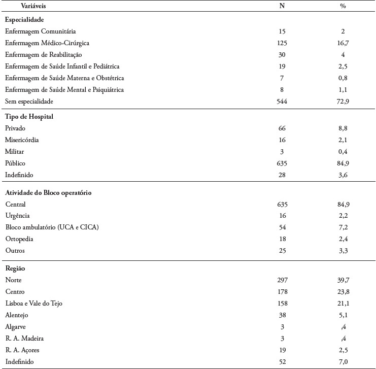 Os 748 participantes eram, na sua maioria, do sexo feminino (436 profissionais ou 58,6%), com idades entre 24 e 64 anos (idade média é 42,9 anos). O estado civil maioritário foi casado (640 profissionais ou 64,2%) e o tempo de exercício profissional variou entre 2 e 44 anos, a média foi de 19,4 anos. Na Tabela 2 são descritos os participantes por especialidade, tipo de hospital, tipo de atividade no bloco operatório e região do país. A maioria dos participantes não tem especialidade (72,9%) e de acordo com as diferentes áreas de especialidades, a especialidade que assume a maior frequência é a especialidade Médico-Cirúrgica (16,7%). A maioria exerce a sua atividade no setor público (84,9%) em blocos centrais (84,9%).