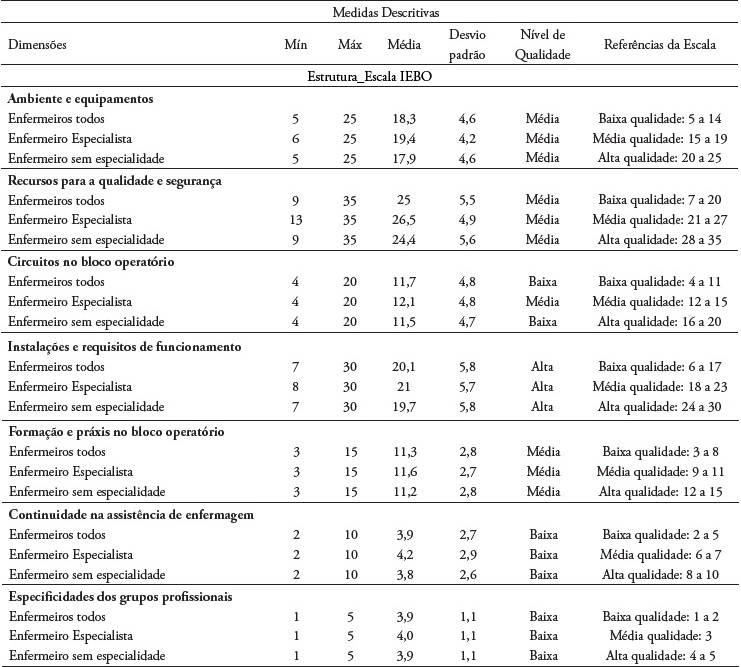 Methodology: A descriptive study was conducted in a sample of 478 nurses working for at least 2 years in an operating room. An electronic questionnaire was applied, including the scales - Structure Indicators in the Operating Room (IEBO), Quality Care Processes in the Operating Room (PQABO), and Quality Outcomes in the Operating Room (RQBO).