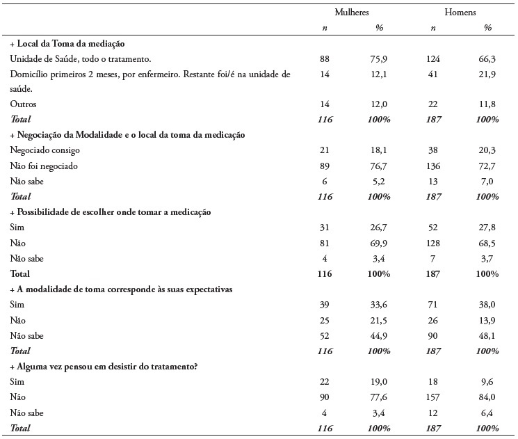 A modalidade e o local da toma da medicação não foram negociadas, em 76,7% (n = 89) das mulheres e em 72,7% (n = 136) dos homens. Também a maioria das mulheres (69,8%; n = 81) e dos homens (68,4%; n = 128) não tiveram possibilidade de escolher o local da toma da sua medicação. Só 33,6% (n = 39) das mulheres e 38% (n = 71) dos homens refere que a modalidade de tratamento corresponde às suas expectativas.