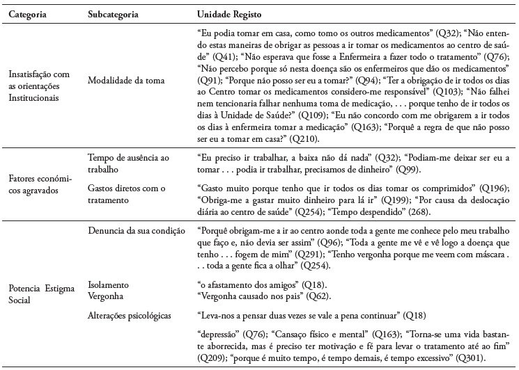 Das respostas à questão aberta relacionada com os motivos pelos quais a modalidade da toma da medicação não corresponde às expectativas dos participantes (Tabela 2), emergem três categorias: a Insatisfação com as orientações institucionais e que se relacionam com a modalidade da toma da medicação; Fatores económicos agravados, quer pelo tempo de ausência ao trabalho e pelos gastos diretos com o tratamento e por último, Potencia o estigma social, pela exposição da pessoa doente ao público, agravado quando o uso de máscara, pelo isolamento e vergonha e ainda pelas alterações psicológicas provocadas na pessoa doente.