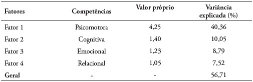Resultados: A análise fatorial exploratória apresentou quatro fatores nesse estudo, que correspondem às competências psicomotora (Fator 1), cognitiva (Fator 2), emocional (Fator 3) e Relacional (fator 4). A análise fatorial confirmatória revelou resultados satisfatórios para todos os índices de ajustamento, e a consistência interna apresentou valor de α = 0,82.