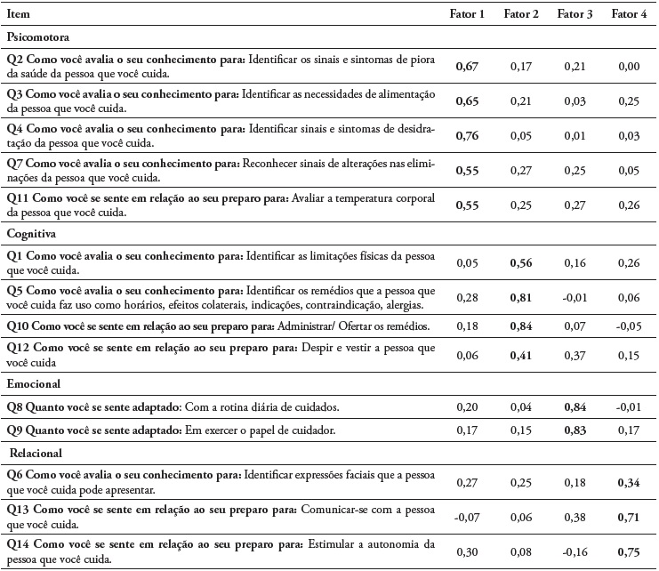 O primeiro fator, operacionalizado pelos itens Q2, Q3, Q4, Q7 e Q11, foi interpretado como sendo referente a Competência Psicomotora e trata-se do fator mais importante para se explicarem as competências do cuidador informal (Tabela 2). O segundo fator, Competência Cognitiva, foi operacionalizado pelos itens Q1, Q5, Q10 e Q12 (Tabela 2). O terceiro fator, Competência Emocional, foi operacionalizado pelos itens Q8 e Q9 (Tabela 2). O quarto fator, Competência Relacional, foi operacionalizado pelos itens Q6, Q13 e Q14 (Tabela 2).