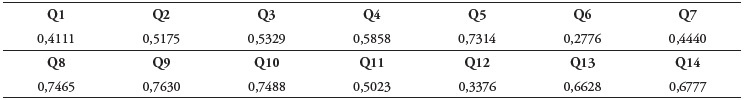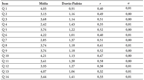 Foi observado que todos os itens apresentaram correlação satisfatória (> 0,30), a qual variou de 0,32 no item Q13 a 0,58 no item Q11. Além disso, constatou-se que a retirada de qualquer um dos itens, inclusive do item 6, não alteraria o alfa de Cronbach (α). Assim, na sua versão final, o questionário manteve os 14 itens, apresentando valor de α = 0,82. O valor de α para cada fator também foi calculado conforme se apresentou a seguir: Competência Psicomotora (α = 0,74), Cognitiva (α = 0,68), Emocional (α = 80) e Relacional (α = 0,46; Tabela 5).