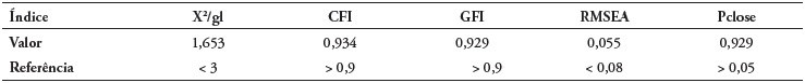 Os índices de qualidade de ajuste obtidos para o modelo, testado na AFC, revelaram resultados satisfatórios, conforme a Tabela 4, a seguir.