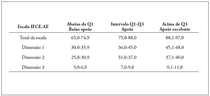 O score geral da escala foi calculado pela média das respostas aos 26 itens da escala IFCE-AE, podendo variar de 26 (mínimo) a 104 (máximo), salienta-se que a dimensão Família como um fardo teve a pontuação invertida. As atitudes de apoio podem ser de suporte ou não face à família, e foram classificadas para análise em baixo apoio, apoio e apoio excelente. Entende-se por atitude de apoio e apoio excelente, o facto de o enfermeiro considerar a família como um recurso no processo de cuidado, alicerçando esse comportamento em princípios de colaboração, que ressaltam a importância de se estabelecer uma boa relação com a família. Em contrapartida, a atitude de baixo apoio é caracterizada por comportamentos que diminuem o envolvimento familiar nos cuidados, traduzindo-se em restrições à presença da família durante algumas atividades ou mesmo em serviços como unidades de tratamento intensivo (Oliveira et al., 2011). Na Figura 1, verificam-se os scores obtidos por quartis classificados em baixo apoio, apoio e apoio excelente.