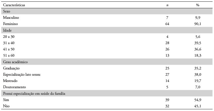 Verificam-se, na Tabela 1, as características sociodemográficas e de formação dos 71 enfermeiros participantes do estudo. Havendo predomínio do sexo feminino com 90,1% (64), e a faixa etária concentrou-se entre 31 e 50 anos, com 76% (54). Quanto à formação, 38,0% (27) possuíam como maior grau académico a especialização lato sensu, sendo em 54,9% (39) dos casos a especialização em saúde da família.
