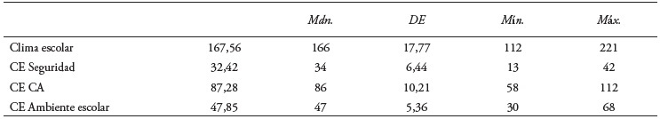 La muestra estuvo compuesta por 41,4% hombres y 58,6% mujeres con una media de edad de 16,2 años (DE = 0,75). De acuerdo con el grado académico, el 7,9% pertenecía al primer semestre, el 41,9% al tercer semestre, el 15,9% pertenecía al cuarto semestre y el 34,4% pertenecía al quinto semestre. En la Tabla 1 se reporta la percepción del clima escolar en los adolescentes con una media de 167,56 (DE = 17,77), así como las subescalas de seguridad = 32,42 (DE = 6,44), compromiso académico = 87,28 (DE = 10,21) y ambiente escolar = 47,85 (DE = 5,36).
