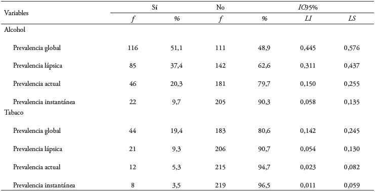 Las drogas consideradas fueron el alcohol y el tabaco, y se observó que el consumo alguna vez en la vida de alcohol fue reportado por más del 50% de los adolescentes, pero solo el 9,7% mantuvo este consumo en la última semana. El consumo de tabaco fue reportado en menor proporción que el de alcohol, donde el 19,4% de los participantes mencionó haber consumido tabaco alguna vez en la vida, de los cuales el 3,5% mencionó haber consumido en la última semana, cifras que se encuentran por encima de lo reportado por la ENCODAT (Gobierno de México, Comisión Nacional Contra las Adicciones, 2017) a nivel nacional. El consumo de alcohol y tabaco se asocia con las convivencias sociales y en México culturalmente ha sido permitido el consumo por los adolescentes en fiestas o reuniones familiares, a pesar de que legalmente está prohibida su venta a menores de edad (López-Cisneros et al., 2016).
