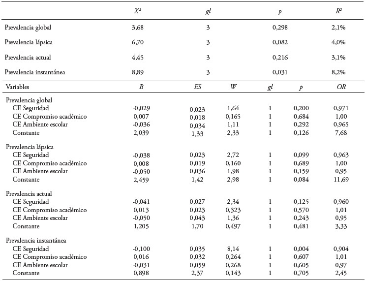 Para responder a la hipótesis se realizó un modelo de regresión logística con las prevalencias del consumo de alcohol y tabaco como variables dependientes y las subescalas del clima escolar: seguridad, compromiso académico y ambiente escolar como variables independientes. En la Tabla 3 se encontró que el clima escolar positivo predice el no consumo de alcohol en la última semana hasta un 8,2% de la varianza explicada, con menor probabilidad de consumo si existe una percepción positiva de seguridad (OR = 0,904; p < 0,01).