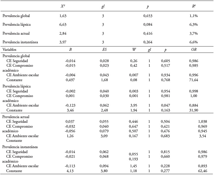 Se calculó el análisis de correlación biserial puntual para examinar las correlaciones entre variables continuas y dicotómicas y el coeficiente de correlación de Spearman para conocer la relación entre variables numéricas. Se utilizó un modelo de regresión logística binaria para examinar el efecto del clima escolar, ingresando las subescalas de seguridad, compromiso académico y entorno escolar como variables independientes y la prevalencia global del consumo de alcohol y tabaco como variables dependientes.