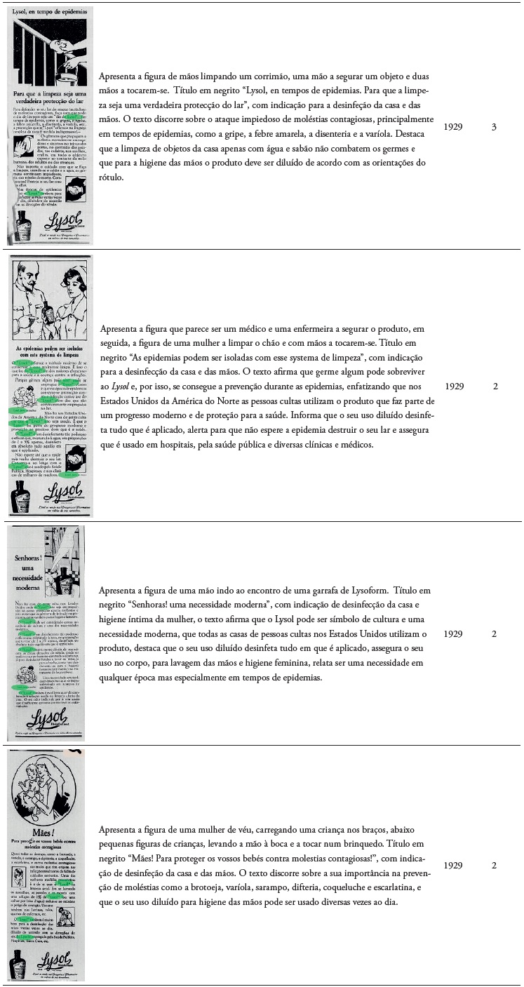 Na pesquisa pela solução Lysol nos manuais de enfermagem e, consequentemente, nas peças publicitárias, considerada como produto de higiene, verifica-se que a mesma é com medicamentos e similares nos semanários da década de 1920 da autoria de Silva et al. (2015).