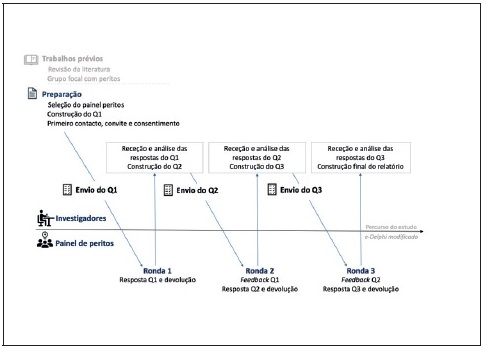 Depois da análise dos dados obtidos através do Q1 foi construído e enviado um relatório aos peritos. Para a construção do segundo questionário (Q2) foram eliminados os itens que alcançaram consenso no Q1, quer para inclusão quer para exclusão, e foram incluídos novos itens que derivaram da análise de conteúdo realizada aos textos escritos pelos peritos nos itens de reposta aberta do Q1. O Q2 foi enviado simultaneamente ao relatório com do feedback do Q1, no dia 1 de novembro de 2020. O acesso dos participantes ao Q2 foi permitido durante as primeiras 3 semanas após a data do seu envio. As respostas foram analisadas de acordo com os procedimentos anteriormente descritos para o Q1. Para a construção do terceiro questionário (Q3) procedeu-se de forma igual ao anteriormente descrito para a construção do Q2. Posteriormente, o Q3 foi enviado simultaneamente ao relatório com do feedback do Q2, no dia 1 de dezembro de 2020. O acesso dos participantes ao Q3 foi permitido durante as primeiras 3 semanas após a data do seu envio. As respostas foram analisadas de acordo com os procedimentos anteriormente descritos para o Q1 e o Q2. O processo das rondas terminou quando foram atingidos os níveis pretendidos de estabilidade e consenso nas respostas. As respostas que ao fim de três rondas não obtiveram consenso, quer para inclusão quer para exclusão, foram consideradas excluídas. No final, procedeu-se à redação de um relatório que reúne todos os dados obtidos ao longo do processo.