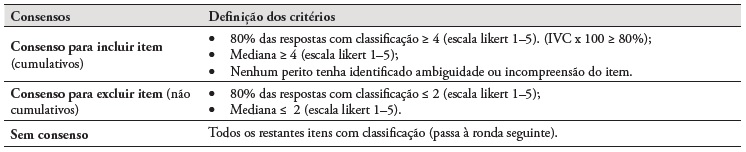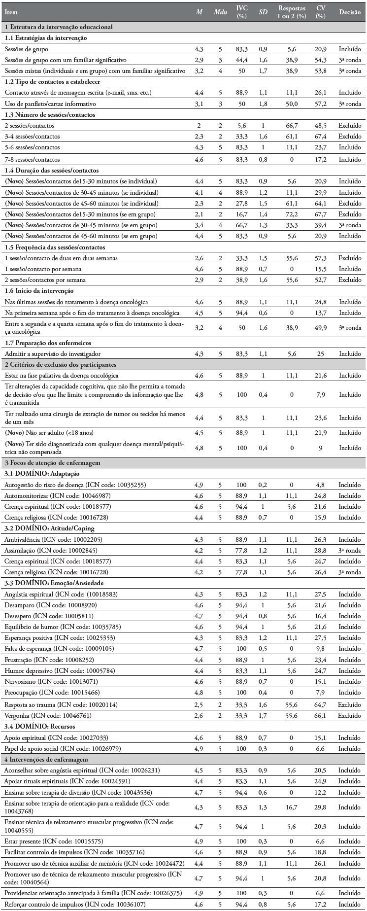 Os restantes 7 itens que não obtiveram consenso nesta ronda avançaram para a ronda seguinte. Não foram adicionados novos itens à Ronda 3. No final da terceira e última ronda foram incluídos 2 itens e foram excluídos 2 itens (Tabela 5). No final das três rondas identificaram-se 3 itens que não obtiveram qualquer consenso e foram excluídos.