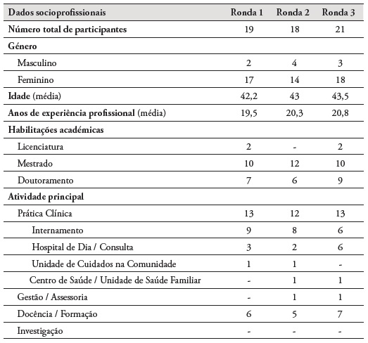 Atendendo aos critérios acima mencionados, obteve-se um painel de peritos constituído por 27 elementos distribuídos por 3 rondas, que correspondem a 58 respostas completas (19 na Ronda 1, 18 na Ronda 2 e 21 na Ronda 3). Em todas as rondas contamos com mais de 50% de participação dos peritos, e este aspeto era um dos critérios previamente definidos para se considerar o consenso. Três dos 30 peritos convidados não participaram em nenhuma ronda. Analisando as características socioprofissionais dos 27 participantes distribuídos pelas três rondas, percebe-se que relativamente à escolaridade são escassos os participantes com grau académico de licenciatura (apenas dois na Ronda 1 e dois na Ronda 3), ou seja, uma ampla maioria tem mestrado ou doutoramento. Não obstante, além de todos os participantes serem detentores do título de especialista atribuído pela Ordem dos Enfermeiros, que era um dos critérios de inclusão no estudo, importa salientar que em todas as rondas se obteve uma média de anos de experiência superior a 19,5, o que juntamente com os dados mencionados anteriormente vem reforçar o nível de expertise dos participantes. Por outro lado, a heterogeneidade da amostra conseguiu-se devido à diversidade da atividade profissional dos participantes, pois não só foram incluídos enfermeiros de várias áreas da prática clínica, como também profissionais na área da docência. As características socioprofissionais dos participantes são apresentadas na Tabela 2.