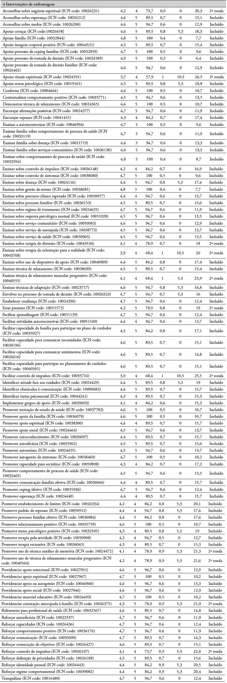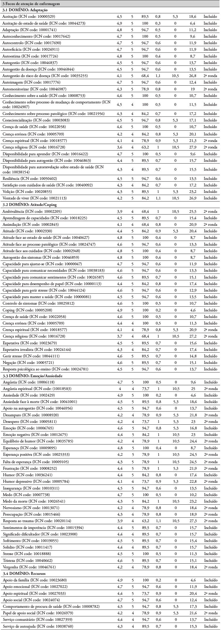 Tendo em conta os critérios de consenso definidos previamente, no final da Ronda 1 foram incluídos 163 itens e foram excluídos 18 itens (Tabela 3).