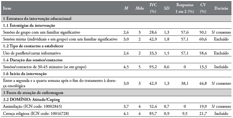 Results: A group of 27 experts validated the inclusion of 33 items related to the structure and 177 items related to the content. The educational intervention should consist of five to eight individual (with the possibility of including a significant family member) and group sessions and focus on the four domains proposed: Adaptation, Attitude/Coping, Emotion/Anxiety, and Resources.