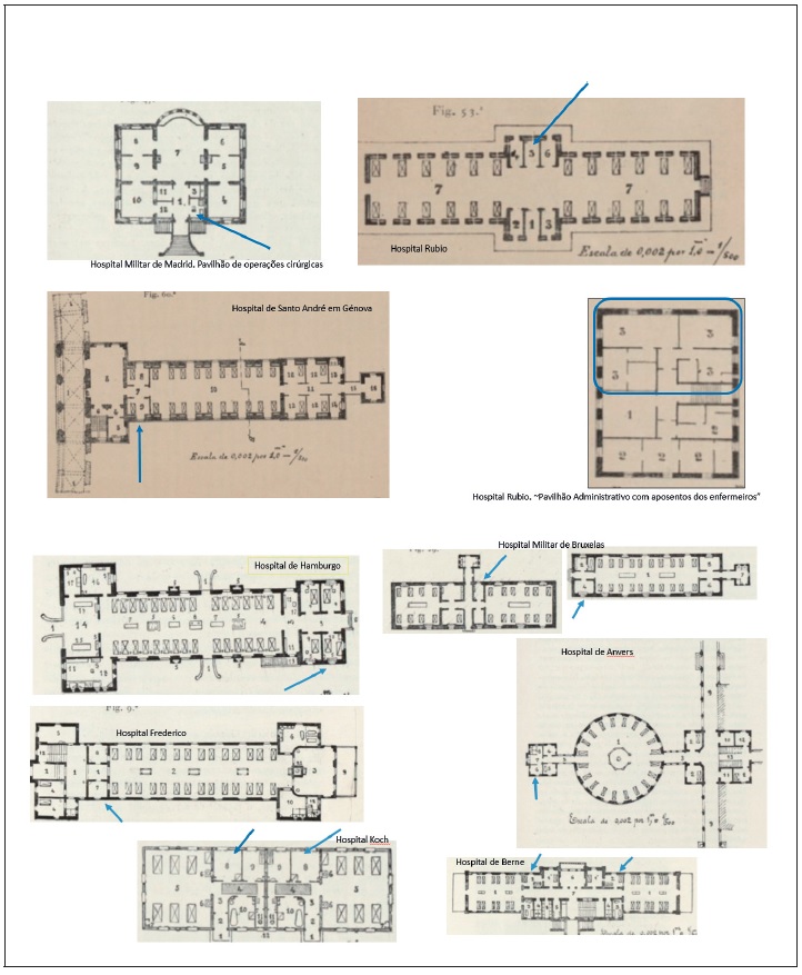 Na explicitação dos espaços e na observação do conjunto de mapas disponibilizados na obra referida (Figura 1), surgem os quarto de enfermeiro/a, bem inseridos nas enfermarias nos seguintes hospitais: Frederico; Urban; Koch; e Militar de Bruxelas, com a indicação de quarto de enfermeiro com pequena fresta de vigilância e quarto de enfermeiro com pequeno fogão de tisanaria; mas também em Anvers, Mons, e Berne, este último quarto tem aberturas de vigilância para a enfermaria, e para o quarto de isolamento; em Aaran dois quartos com frestas de vigilância; em Roma, um quarto para o enfermeiro com o pequeno fogão de tisanaria e dois quartos para enfermeiros designados por guardias; no Hospital Militar de Madrid, surge a indicação de ao lado da enfermaria, ficaram dois quartos de enfermeiros, nos quais se descreve um pequeno fogão para aquecimento de medicamentos, e ainda compartimentos para o enfermeiro no pavilhão de alienados e no pavilhão de hidroterapia; no Hospital Rubio, em Madrid e no de Santo André em Génova, também quarto para enfermeiros. Verificamos no Hospital Militar de Bruxelas, um jardim dos enfermeiros junto à habitação dos mesmos e latrina para seu uso; em Roma, uma casa de enfermeira; No Hospital Rubio de Madrid o pavilhão de serviços administrativos ocupado pelo dormitório e mais alojamentos dos enfermeiros.