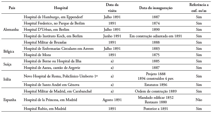 A leitura e análise do livro “Hospitaes Extrangeiros de Construcção Moderna. Allemães, Belgas, Suisso, Italianos e Hespanhoes”, de Costa Simões, publicado em 1901, permitiu-nos identificar um conjunto de Instituições visitadas por Costa Simões com referências a enfermeiros (Tabela 1), de onde recolhemos ao seguintes tópicos de análise: i) Os espaços hospitalares, os quartos dos enfermeiros, e as residências; ii) as dotações de enfermeiros e enfermeiras; iii) a formação de enfermeiros e enfermeiras; iv) as irmãs da caridade.