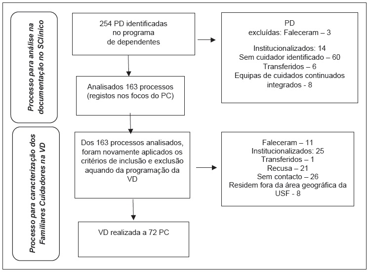 Na consulta das listagens do programa de saúde de dependentes (março, 2017), foram identificadas 254 PD. Na primeira fase de colheita de dados foram selecionadas 163 PD, para consulta dos respetivos processos clínicos. Na segunda fase de colheita de dados realizou-se a visita domiciliária (VD) a 72 PC (Figura 1).