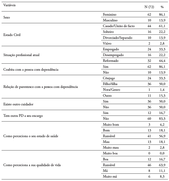 Dos 72 PC, 62 (86,1%) são mulheres com uma média de idades de 61,9 ± 13,6 anos (23-89) com elevada escolaridade (8 ± 4,5 anos; 0-18). A maioria 44 (61,1%) são casados/união de facto, reformados 32 (44,9%) e 62 (86,1%) coabitam com a PD. Em 36 (50%) das situações são filhas/filhos e 36 (50%) referem ter outro cuidador. Cuidam da PD, em média há 8,10 ± 7,0 anos (1-39), cerca de 11,8 ± 8,8 horas nas 24h e 60 (83,3%) não tinham outra PD a cargo. Dos PC, 55 (76,4%) têm problemas de saúde, o mais frequente (33; 60%) é hipertensão arterial. A maioria perceciona o seu estado de saúde como razoável (41; 56,9%), bem como a sua qualidade de vida (46; 63.9%). (Tabela 1).